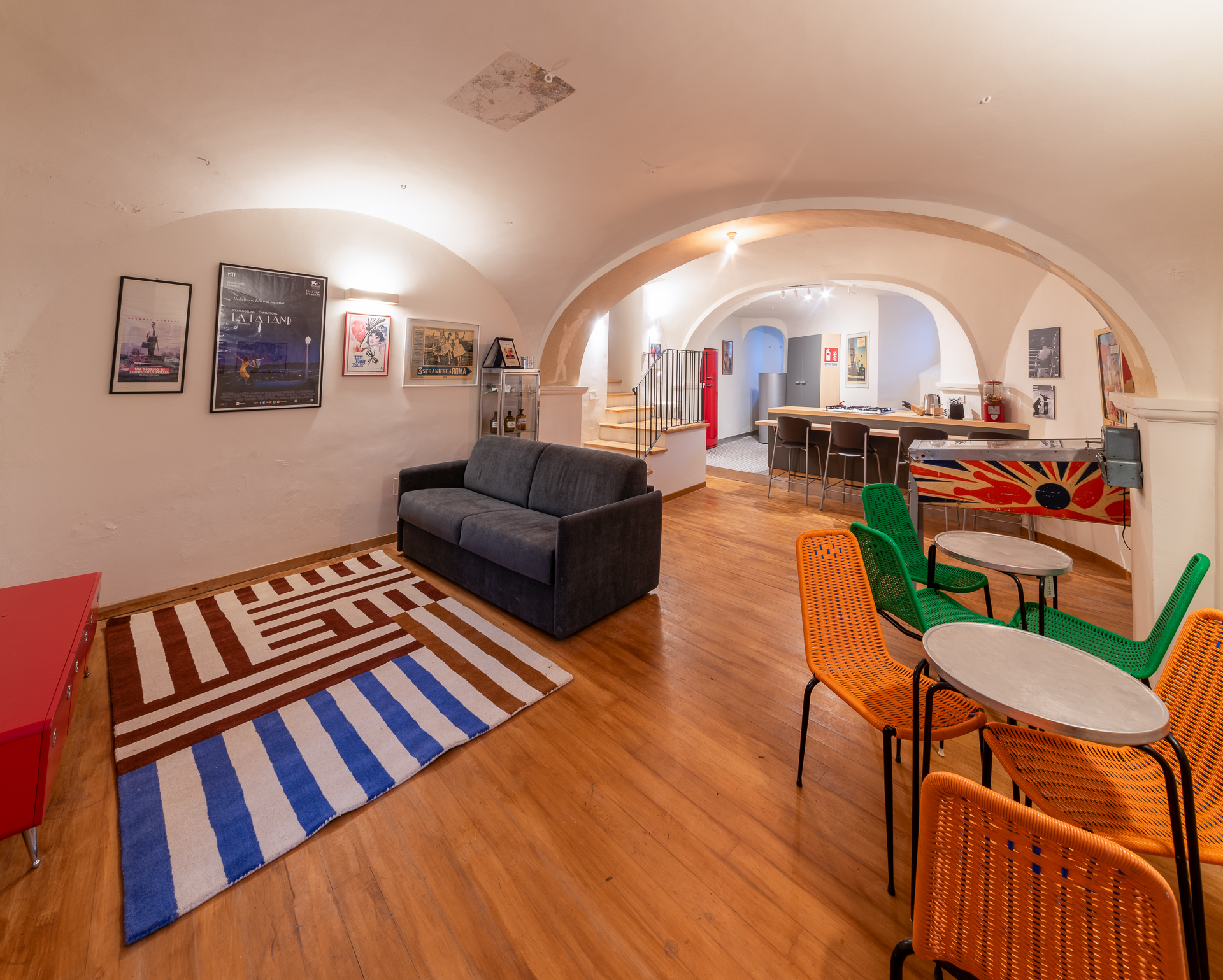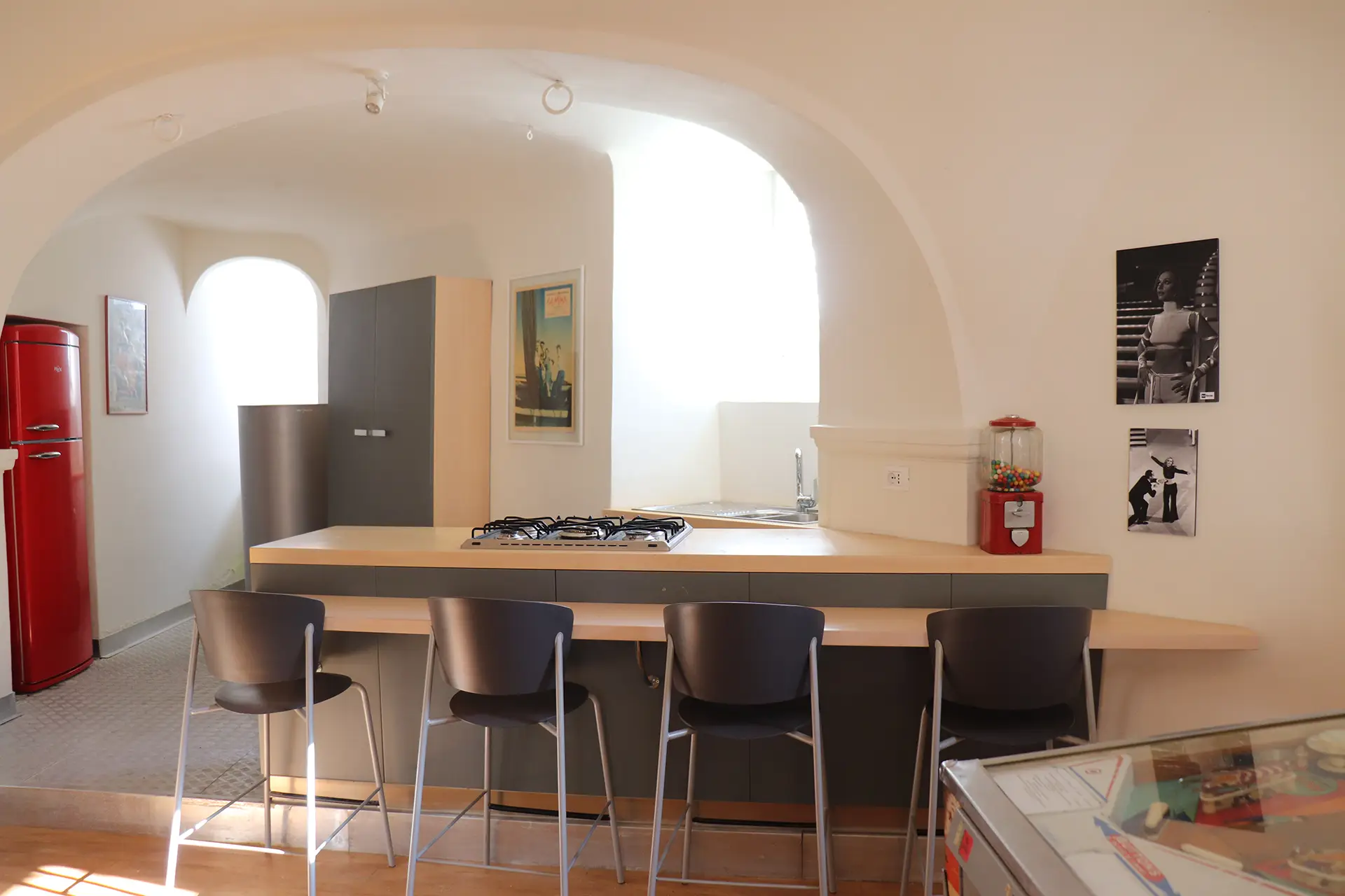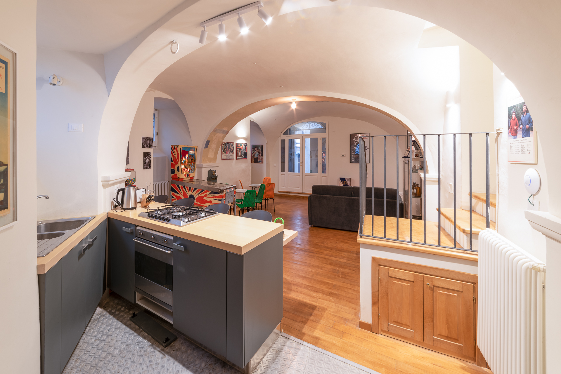 Arredato con elementi di modernariato che ricreano l’atmosfera di un bar degli anni 60, l’appartamento presenta un ampio open space con un bancone che separa l’area cucina e, salendo pochi gradini, una ampia camera da letto matrimoniale e il bagno.