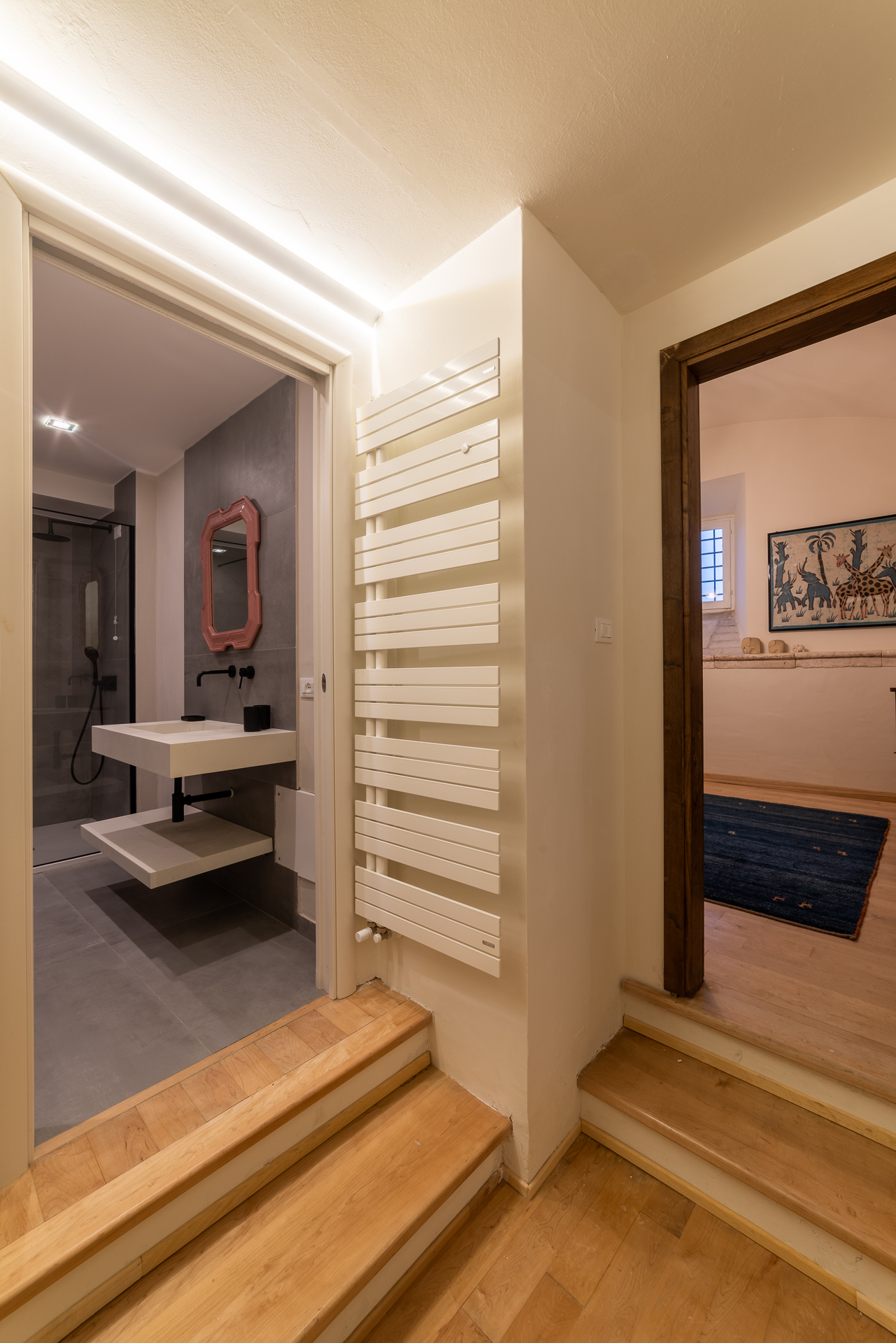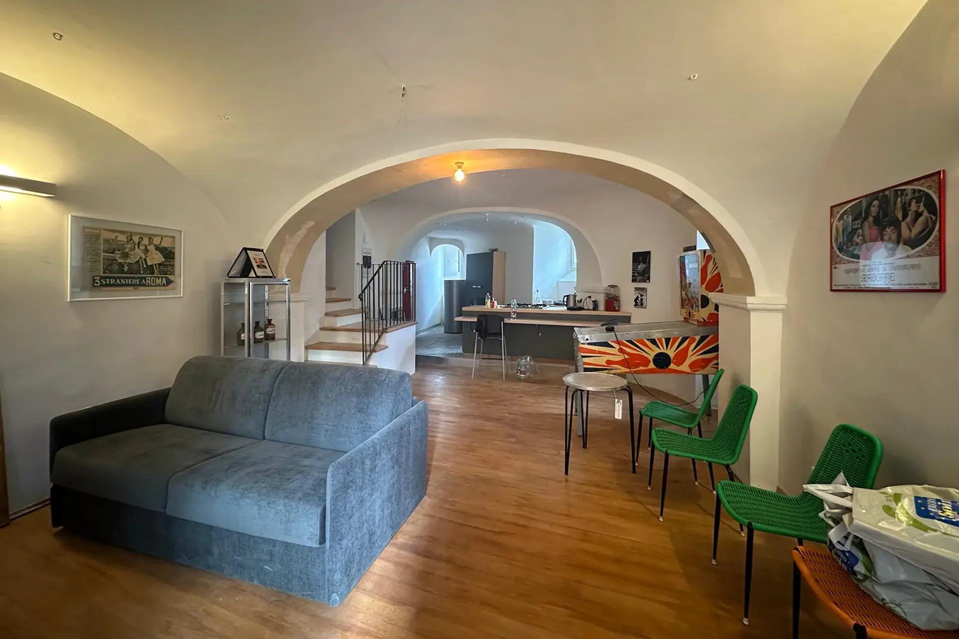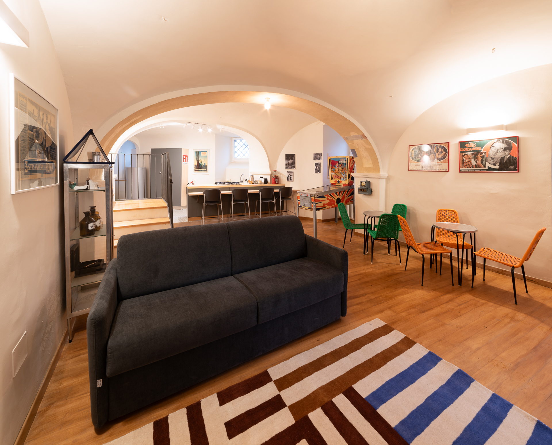 Arredato con elementi di modernariato che ricreano l’atmosfera di un bar degli anni 60, l’appartamento presenta un ampio open space con un bancone che separa l’area cucina e, salendo pochi gradini, una ampia camera da letto matrimoniale e il bagno.