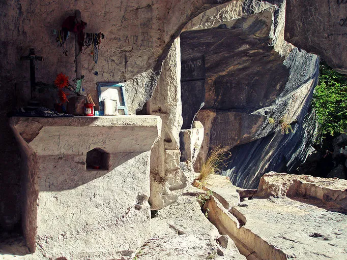 Attenzione! Questo tratto di sentiero, ad un certo punto, è molto esposto su di un precipizio, per cui è sconsigliato a coloro che non sono abituati al vuoto, soffrono di vertigini o a ragazzini troppo piccoli; - superare la sbarra, proseguire per un brevissimo tratto sul B1 e deviare successivamente a destra sempre sul sentiero segnato come S. Questa seconda possibilità consente di raggiungere l´eremo in una ventina di minuti, evitando il tratto più esposto. Bisogna comunque fare attenzione nell’ultimo tratto, quando bisognerà scendere alcuni ripidi gradoni scavati nella roccia. Se non avete problemi di allenamento o di vertigini potete percorrere entrambi i sentieri ad anello.