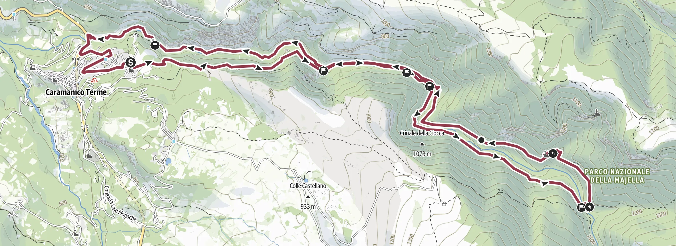 La partenza è da Decontra, poco lontano da Caramanico, centro del parco della Maiella, seguendo il sentiero B1 che, dopo aver superato due fontanili, sale sulla carrareccia ed entra nel bosco di faggio, giungendo ad una sbarra. Dalla sbarra si hanno due possibilità: