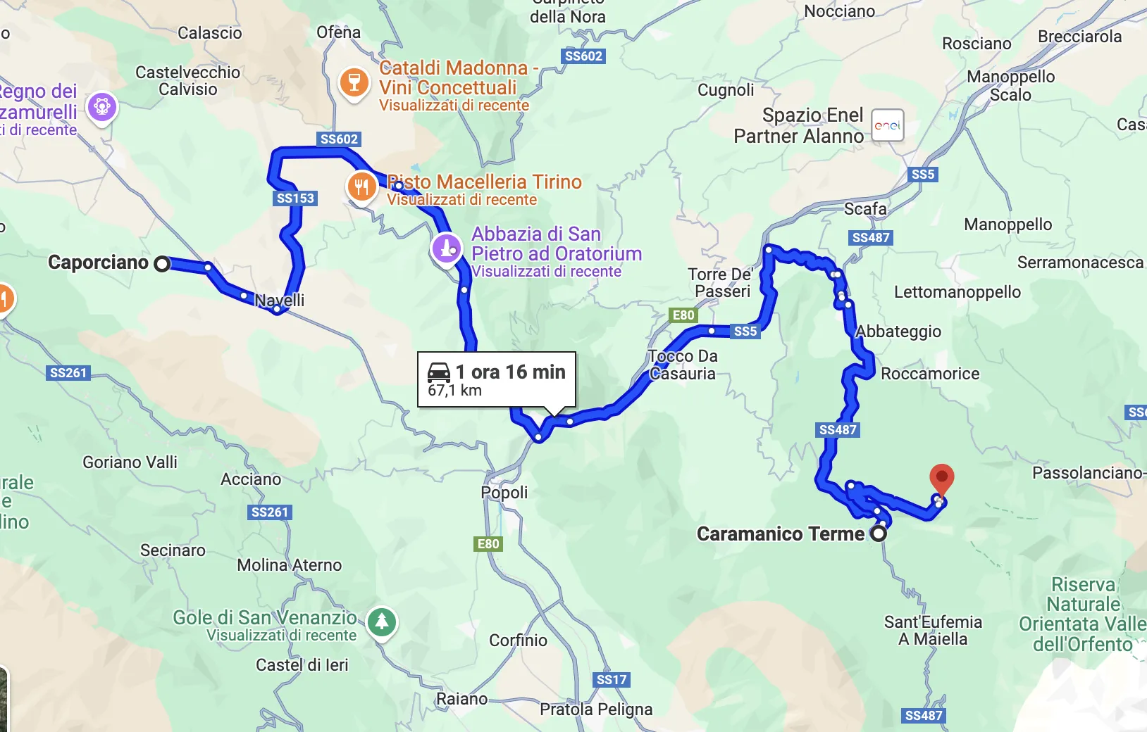 A seconda del punto di partenza prescelto per l’escursione, da Caporciano è circa un’ora, un’ora e mezza di auto. Anche in questo caso ci limitiamo a ricordare un paio di possibili itinerari, rimandandovi alle numerose guide cartacee e online.