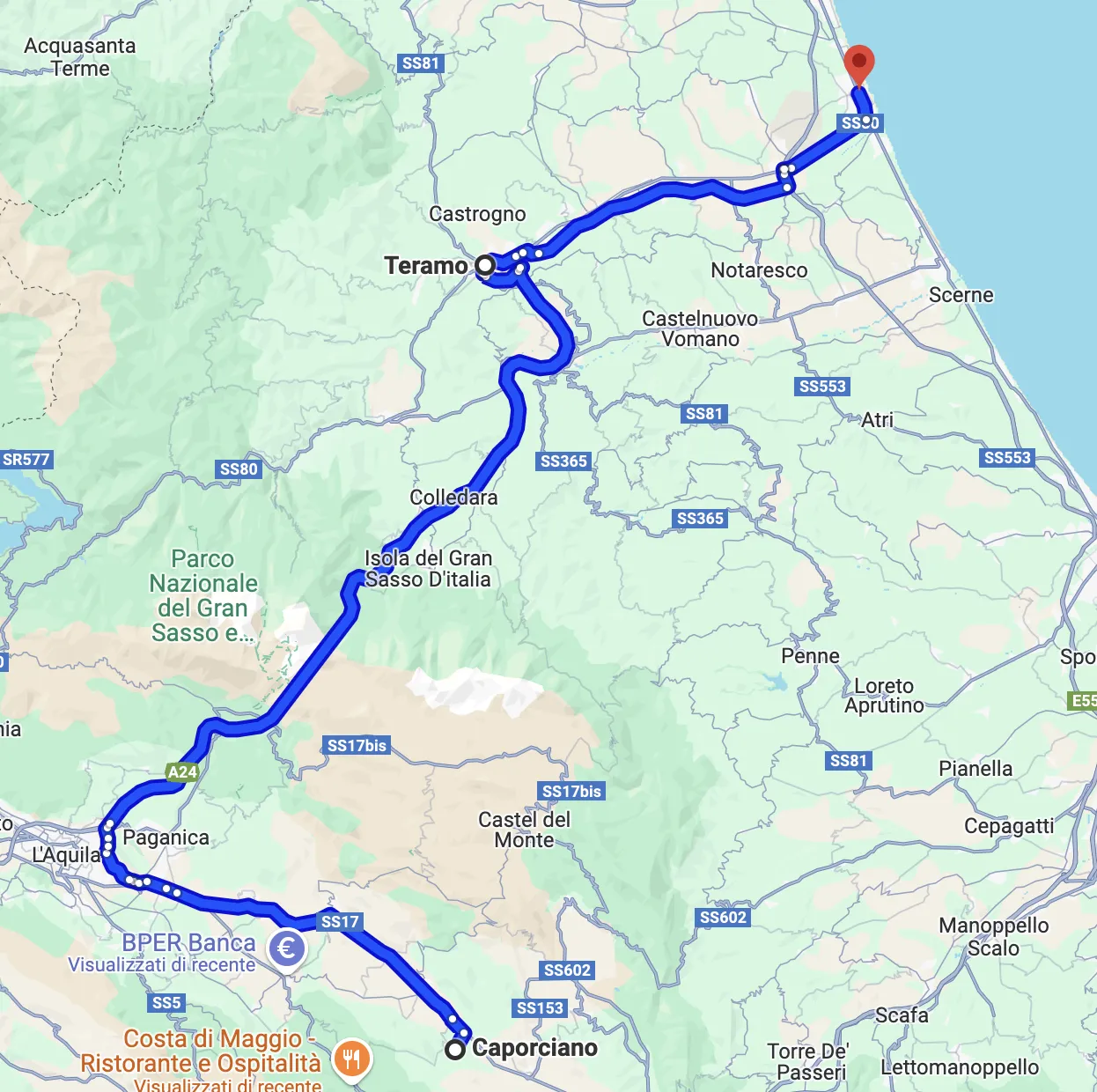 Teramo si raggiunge in auto da Caporciano in circa un’ora, tornando verso l’Aquila, entrando sulla A24 a Aquila Est e passando sotto il “famoso” tunnel del Gran Sasso, dove potrete notare l’accesso sotterraneo ai laboratori di fisica. All’uscita un panorama eccezionale, con la parete della montagna a strapiombo.