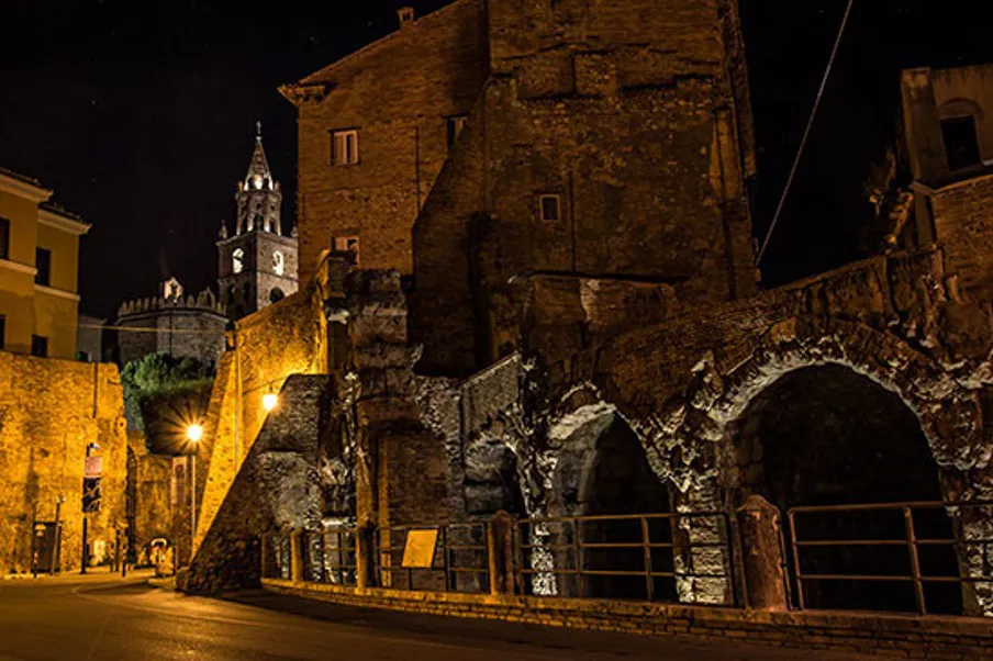 A pochissima distanza dal teatro romano ci sono i resti dell’anfiteatro. Questo è più recente, risale infatti al I secolo dopo Cristo ed aveva una forma ellittica con un perimetro di ben 208 metri. Lungo le mura, in parte inglobate dagli edifici successivi, è possibile scorgere la curvatura dell’anfiteatro, i diversi ingressi e alcuni elementi architettonici originari.