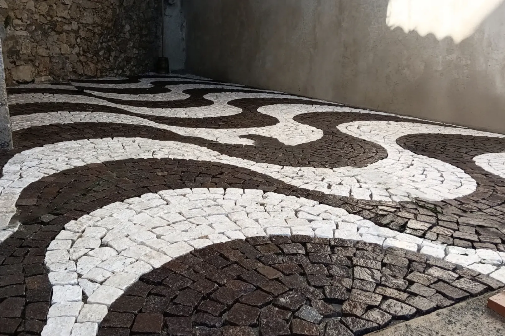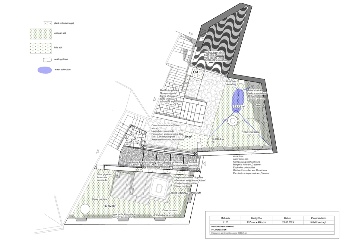 Il giardino terrazzato si sviluppa su 4 livelli, con visione panoramica sulla Piana, in direzione Civitaretenga/Navelli. Il livello superiore è una terrazza semi coperta, caratterizzata da una pavimentazione portoghese, posata da un “mestre calçeteiro” di Lisbona, in omaggio al legame che lega la famiglia Portante-D’Alessandro con il mondo lusitano.