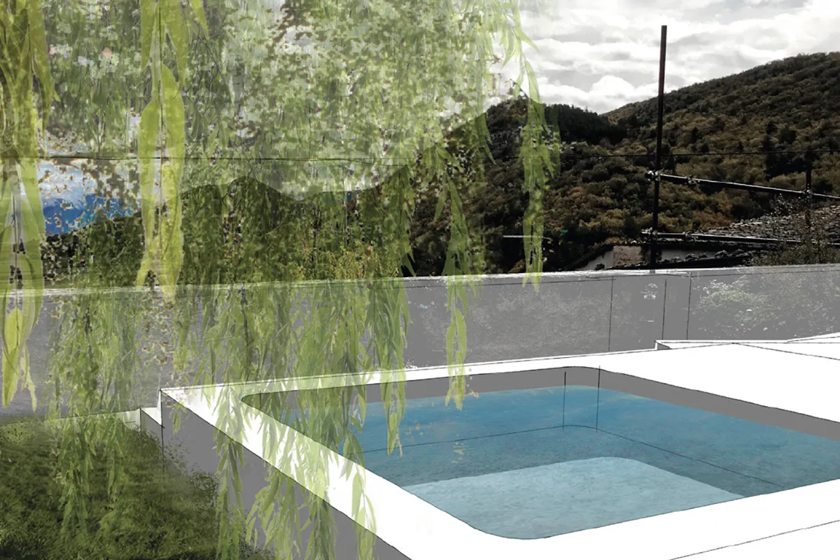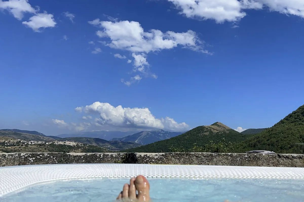 Scendendo ancora si arriva al livello inferiore dove un deck in legno ospita una grande vasca Jacuzzi, sempre con visione panoramica sulla vallata. Una pergola copre il passaggio che dal portoncino del “piano terra” porta all’antica porta carraia.