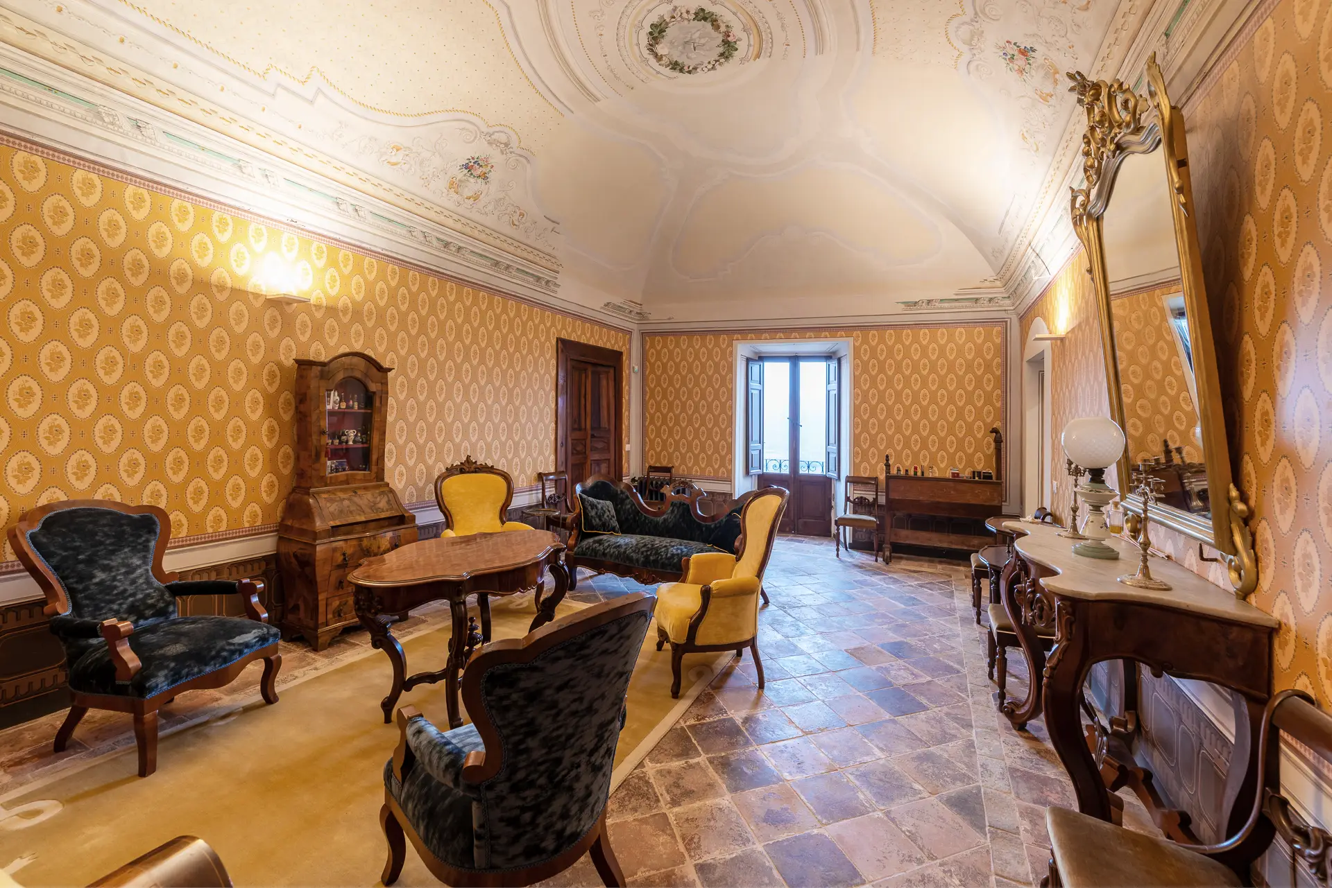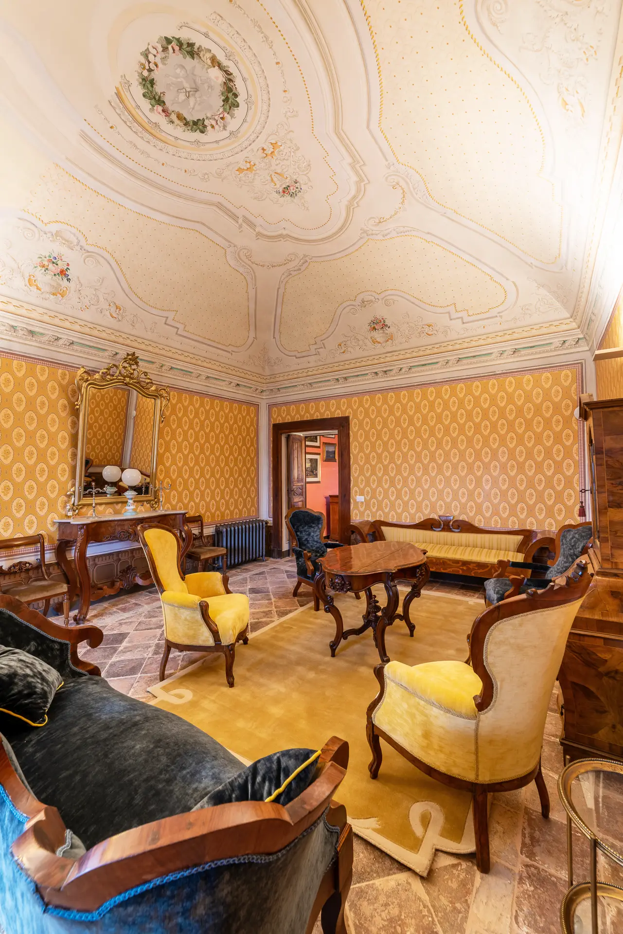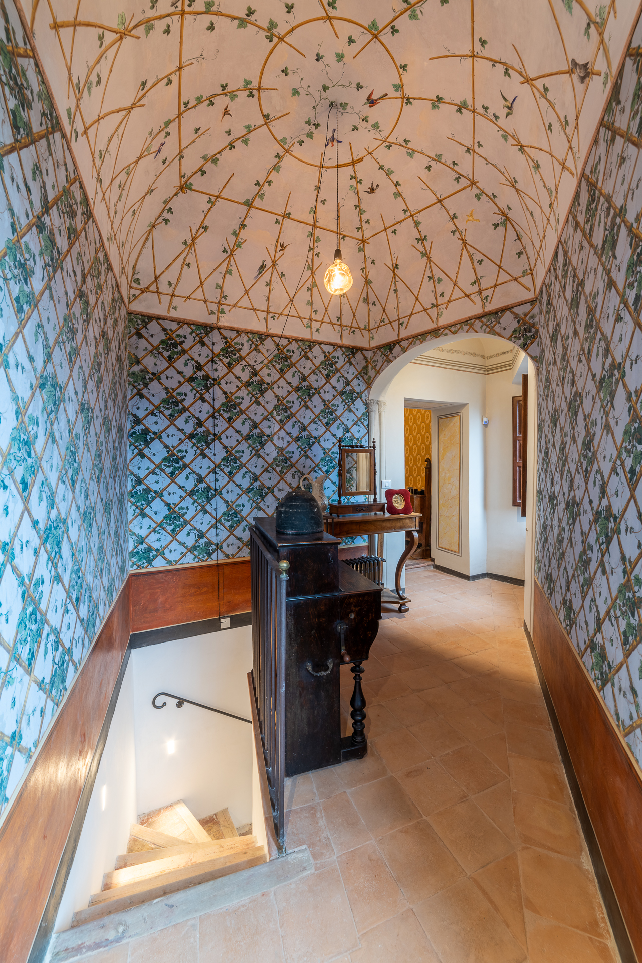 I soffitti sono tutti finemente affrescati con i decori originali mentre alle pareti la carta da parati è stata attentamente riprodotta in Inghilterra su campioni dell’originale, rovinata dal tempo e dai lavori di consolidamento.