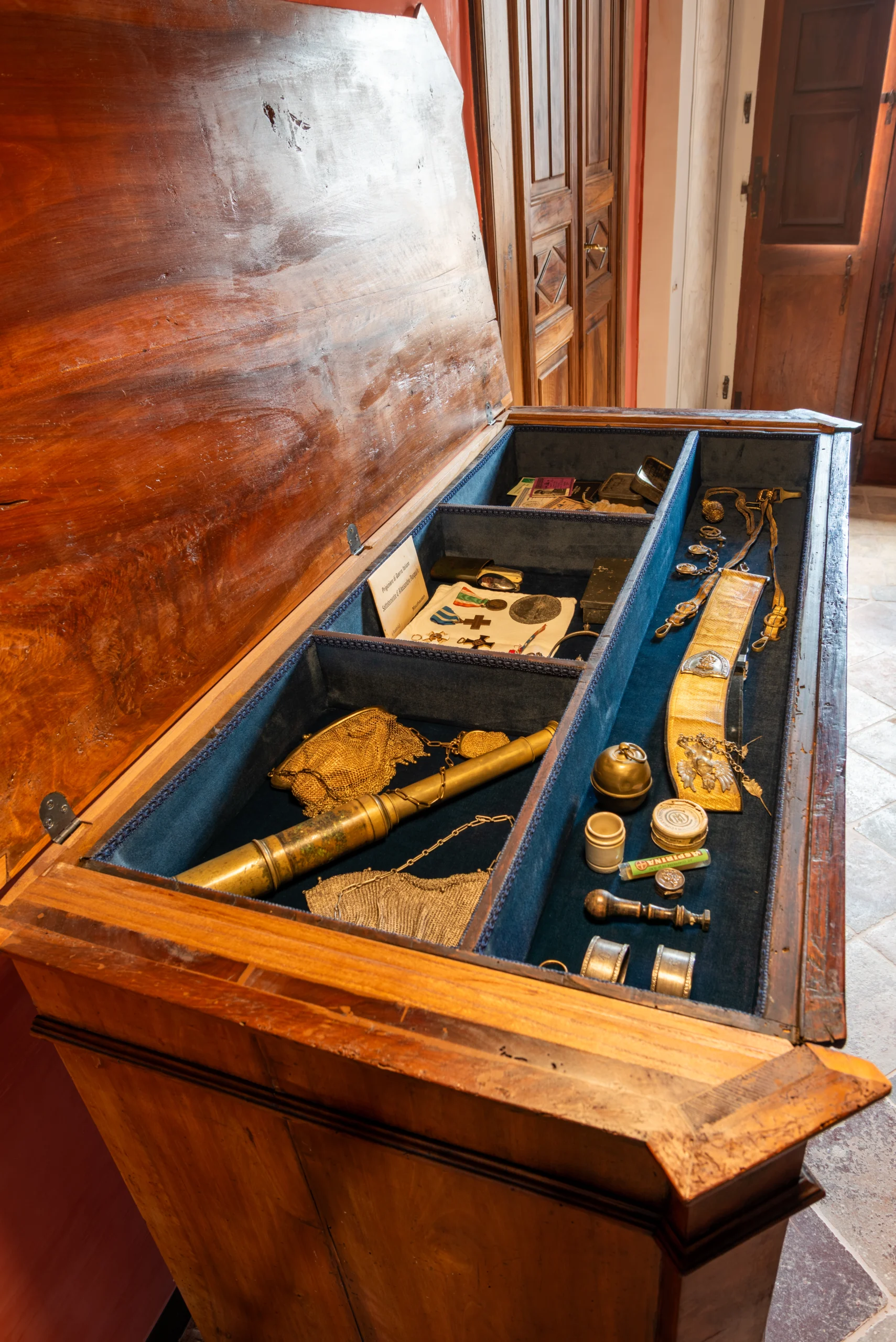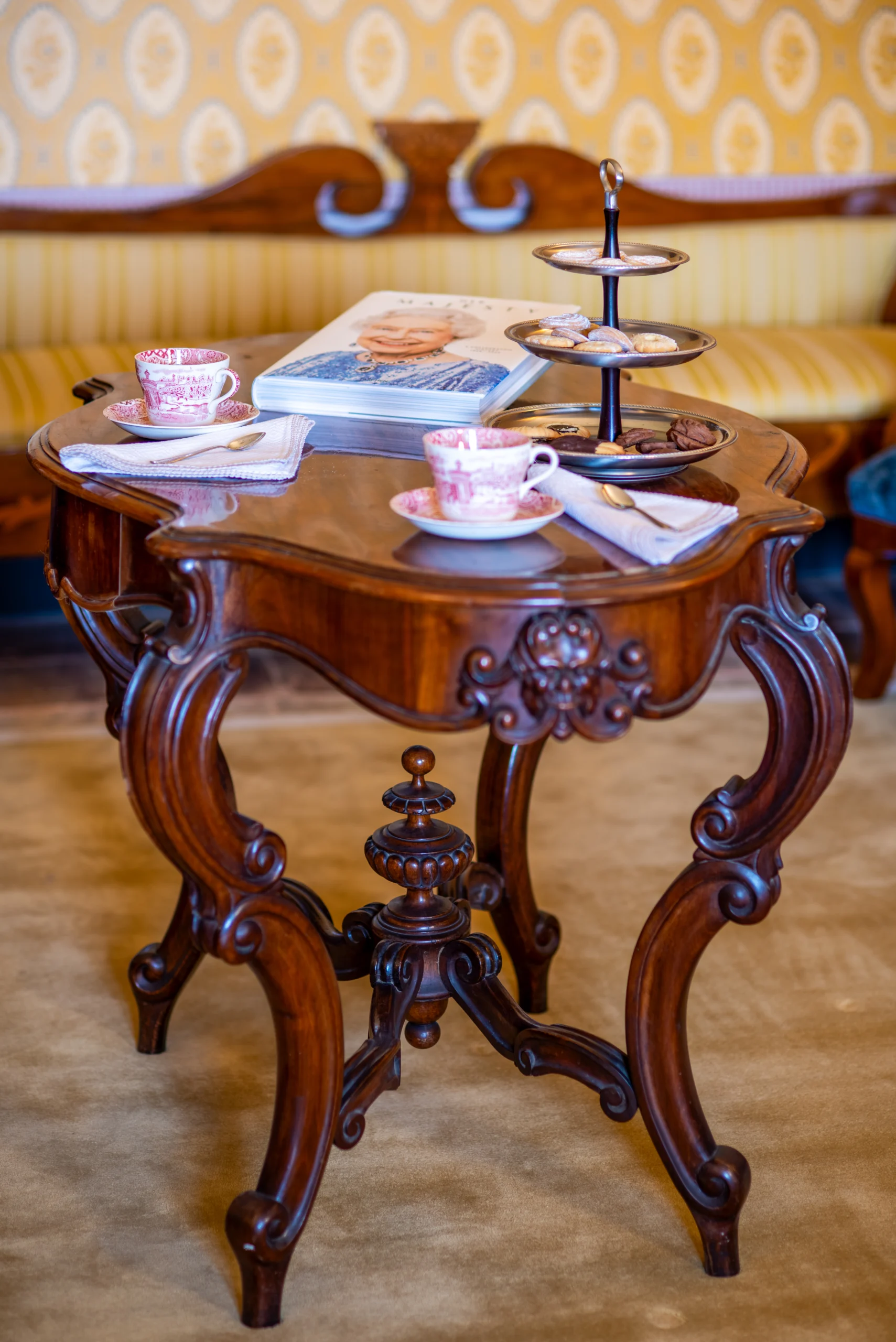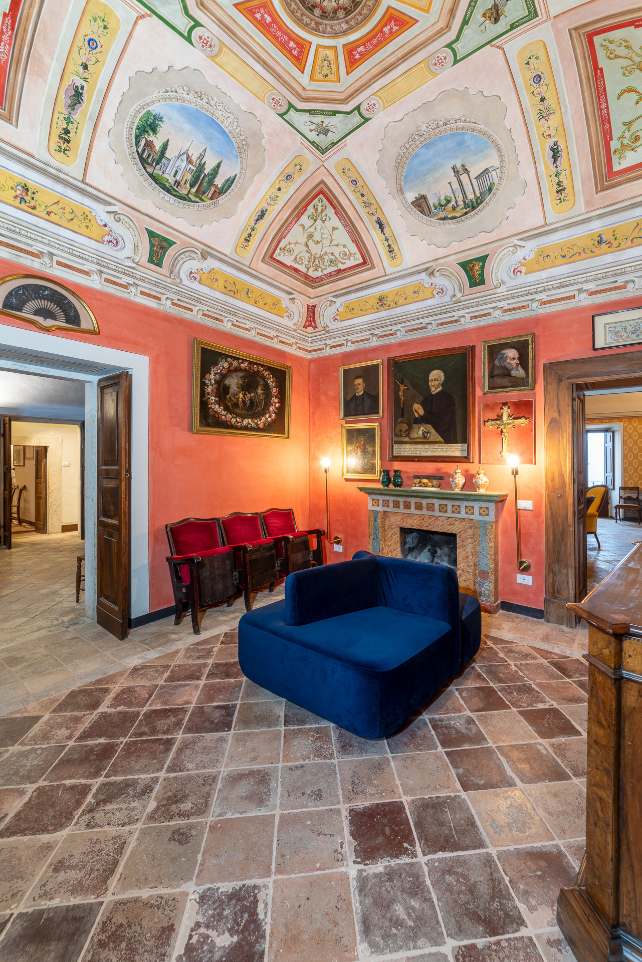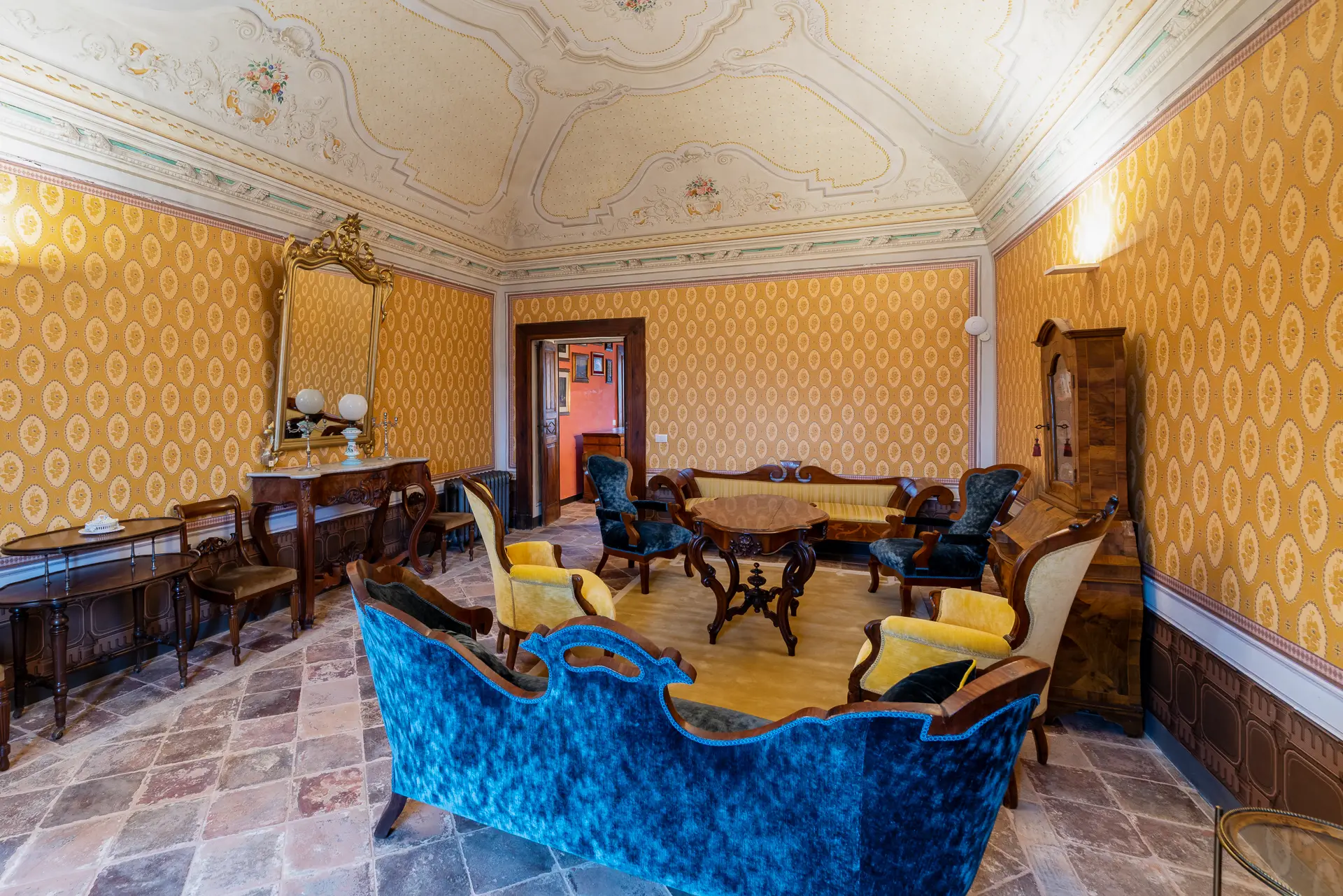 I soffitti sono tutti finemente affrescati con i decori originali mentre alle pareti la carta da parati è stata attentamente riprodotta in Inghilterra su campioni dell’originale, rovinata dal tempo e dai lavori di consolidamento.