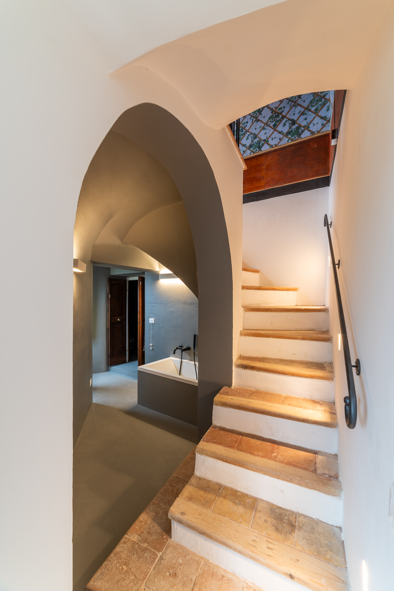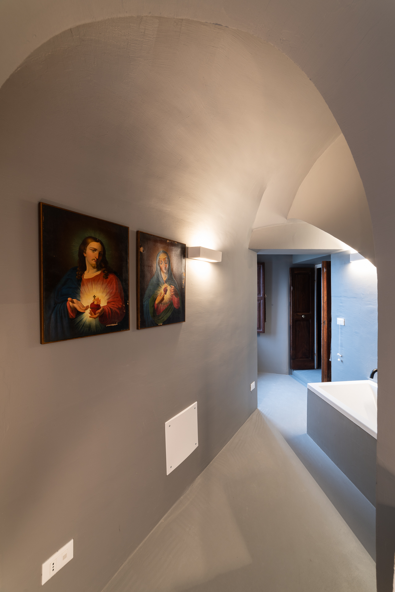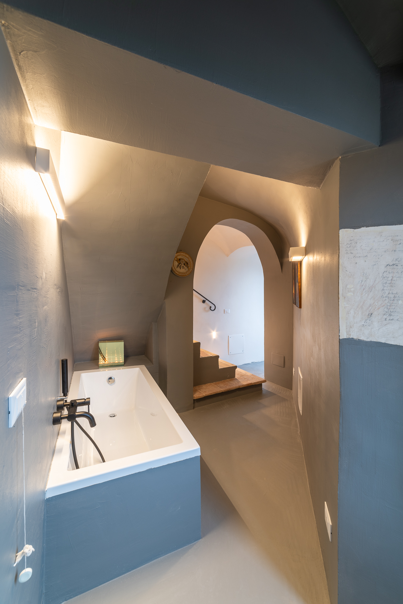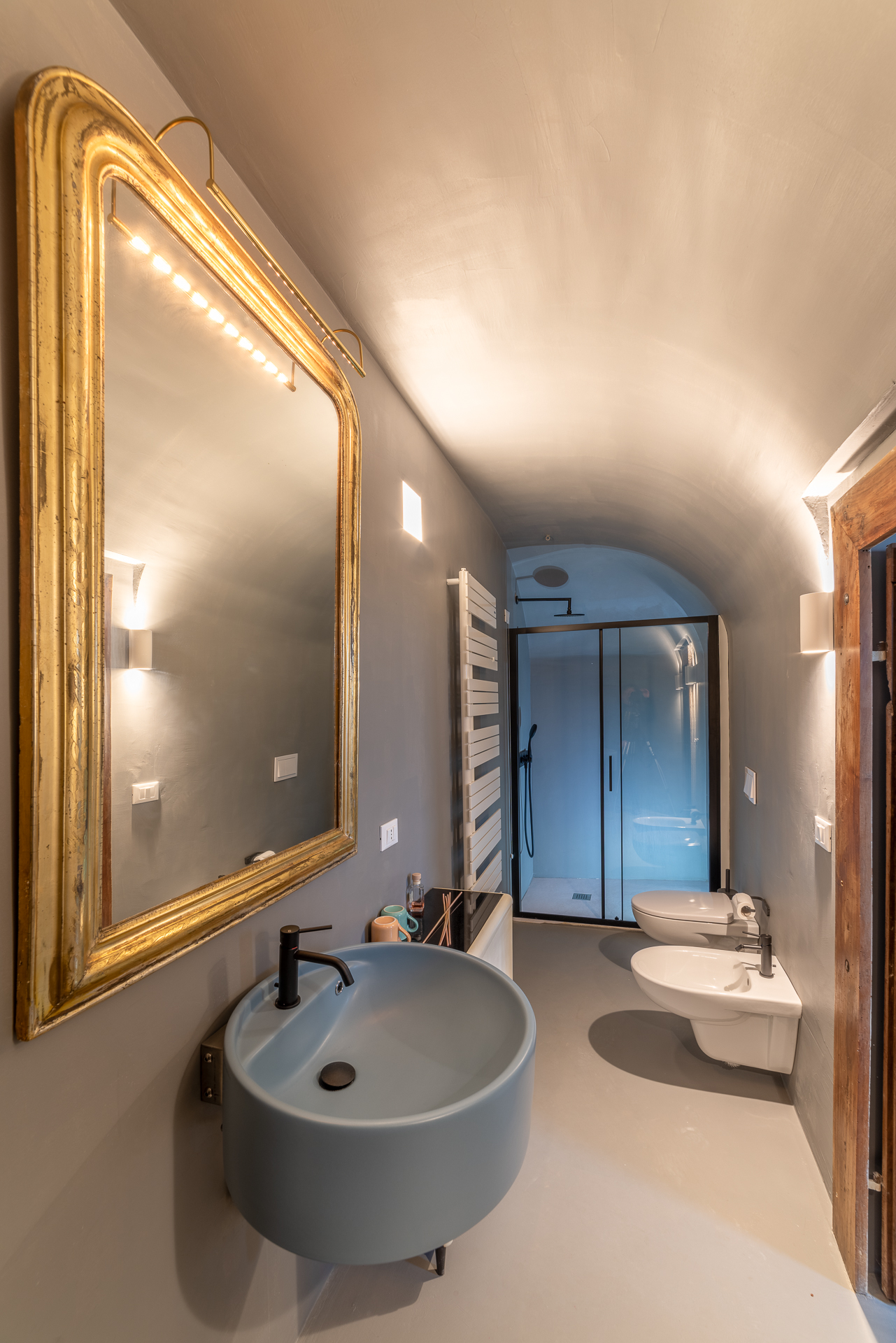 - La zona bagno, che comprende, su due locali, tutti i servizi, box doccia e vasca, è situato ad un livello inferiore servito da una scala. In ciascuna stanza è comunque presente un lavabo che richiama i vecchi lavamani.